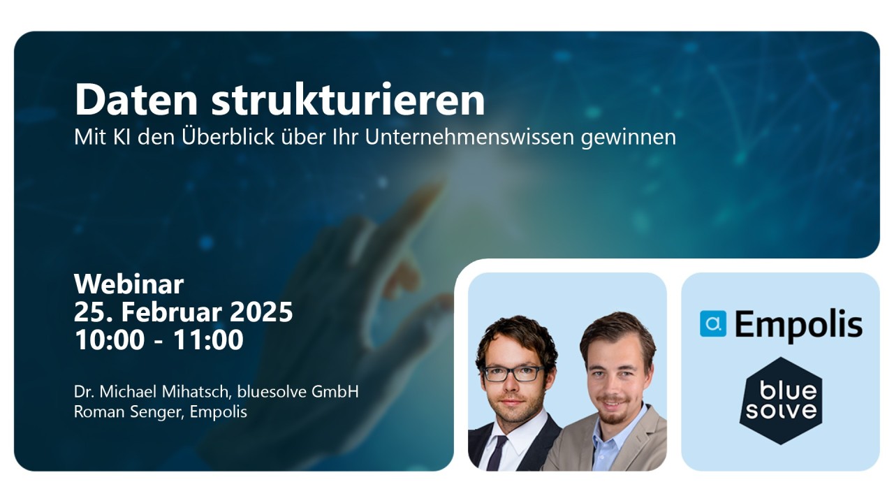 Daten sind die Grundlage für nachhaltigen Erfolg. Entscheidend ist, den Überblick zu behalten und Informationen so aufzubereiten, dass sie im Alltag wirklich wirken. In diesem gemeinsamen Webinar mit der bluesolve GmbH erfahren Sie, wie Sie die Wissensbasis Ihres Unternehmens effizient strukturieren und gezielt für den Einsatz von Künstlicher Intelligenz optimieren.